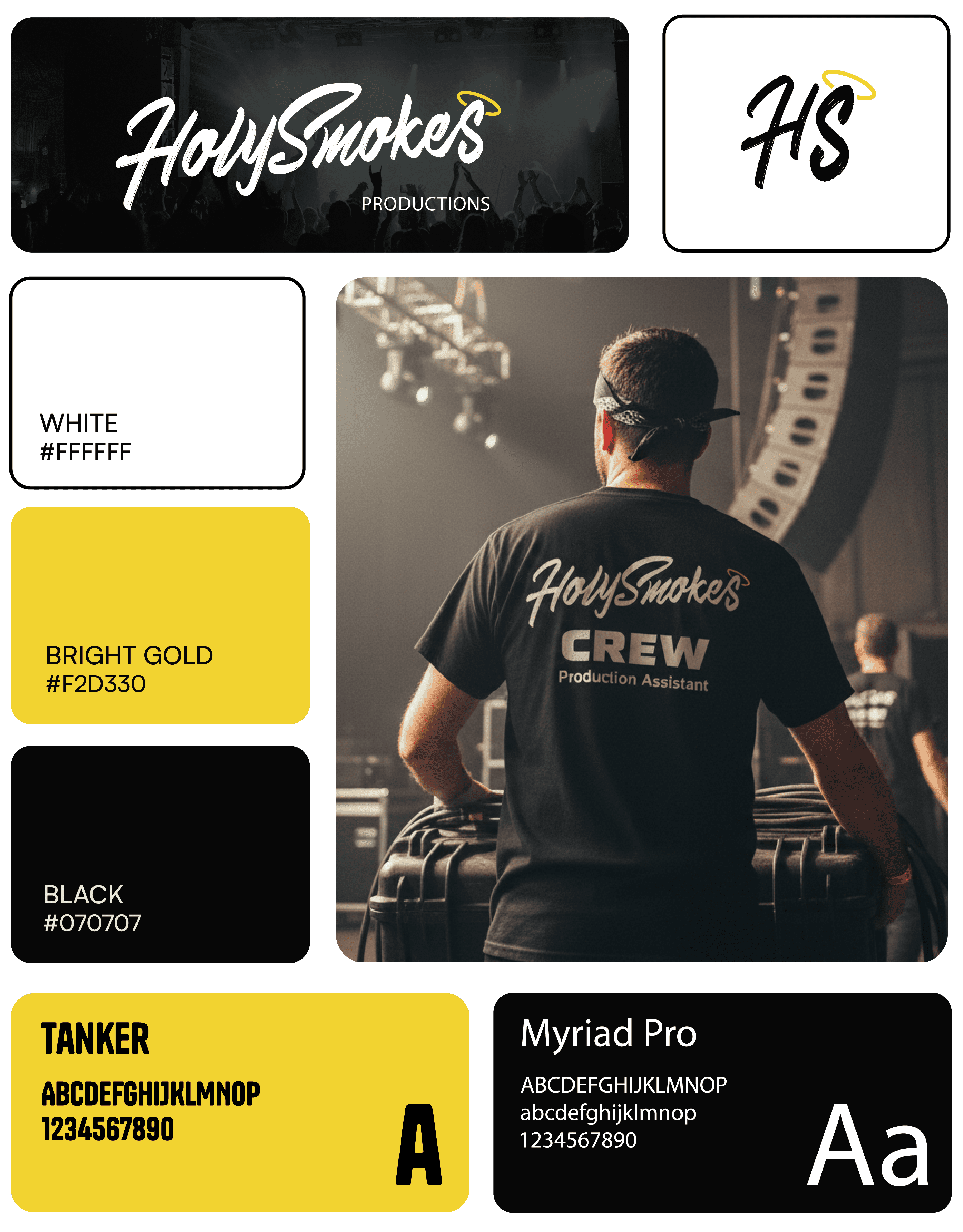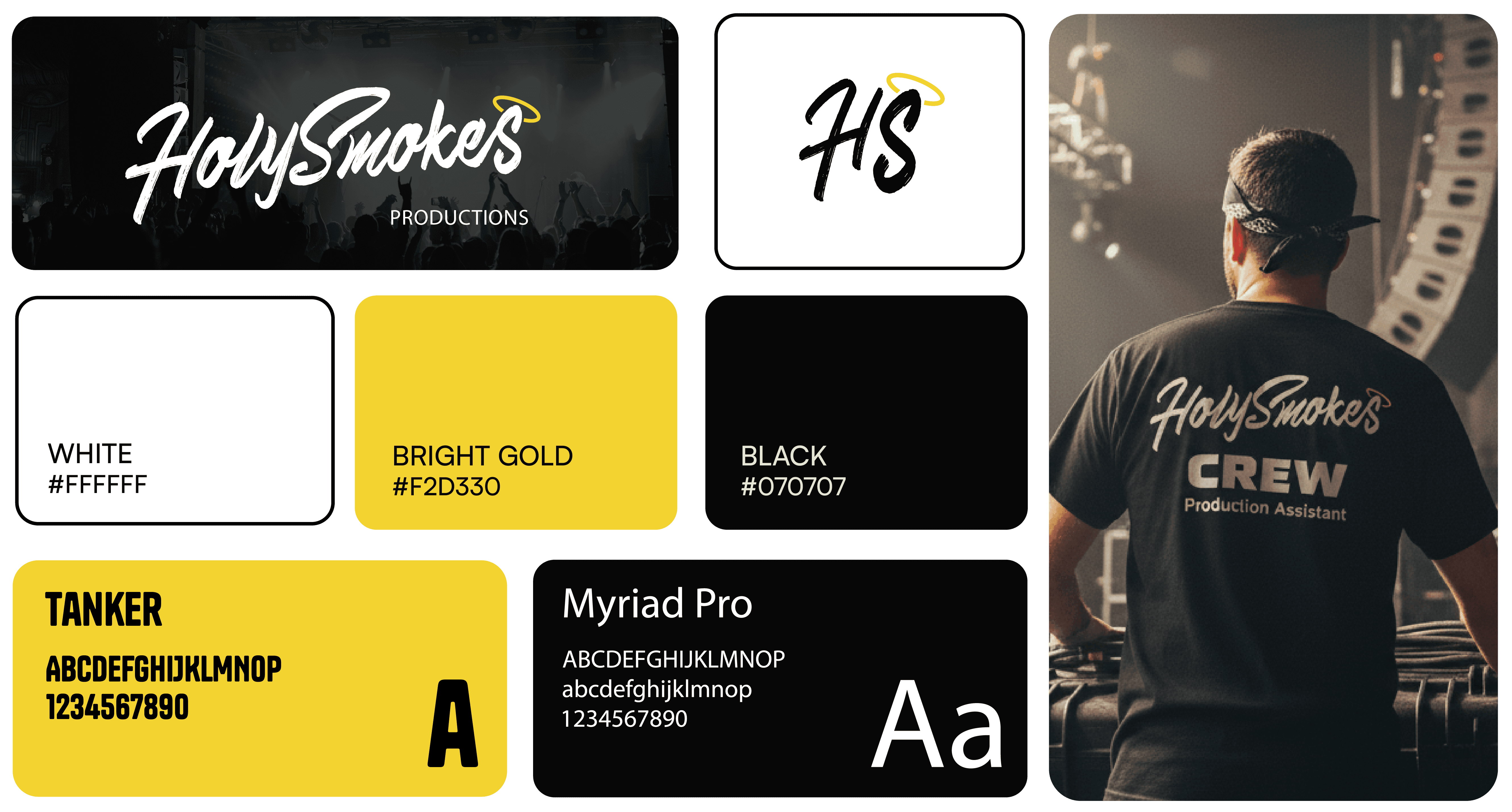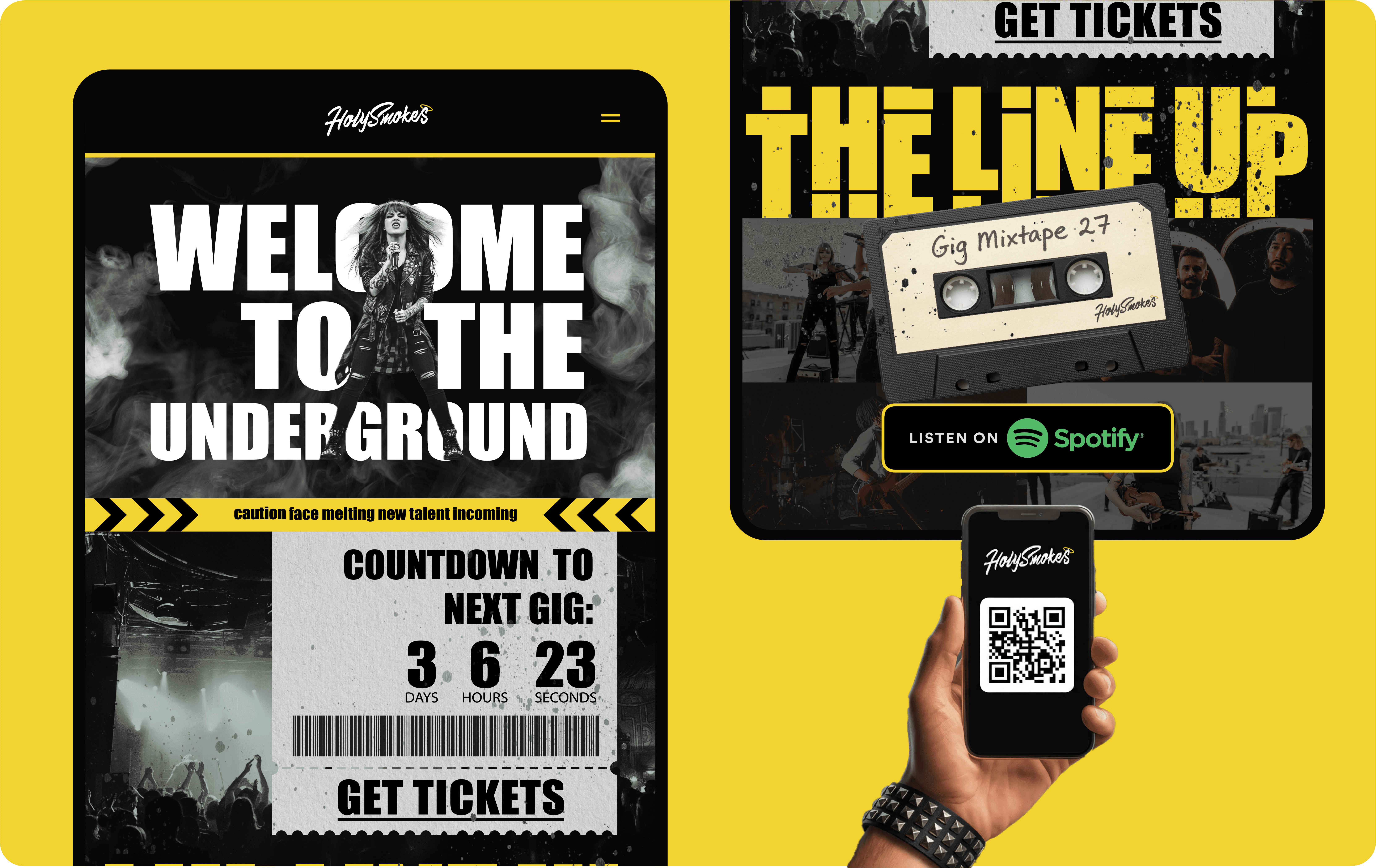 We partnered with Holy Smokes Productions, a dynamic band promoter and management agency that champions underground and up-and-coming bands. They not only book gigs and manage artist careers but also drive their growth on streaming platforms like Spotify. Their brief was to develop a bold, rock-and-roll inspired brand that would resonate with the underground scene, while also serving as a platform to promote gigs and drive Spotify streams—without using traditional advertising.